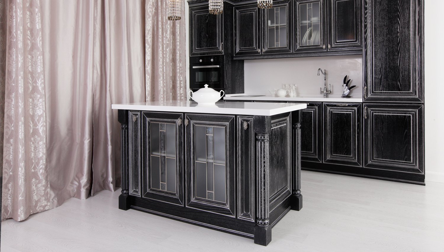 Описание: Секрет. Часто классические кухни с островом устанавливают не для готовки, а для создания камерной обстановки в гостиной. Для таких целей обычно используют фасады из дорогих итальянских коллекций. В моде чёрное седое дерево, красно-бордовый винтаж, темно - зелёные оттенки с фактурой дерева.